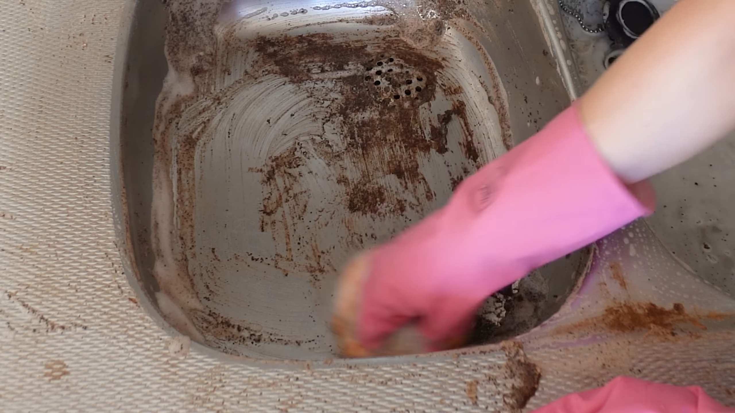 4. Reinigen: Spüle den Topf oder die Pfanne gründlich mit heißem Wasser und Spülmittel aus. Verwende einen Schwamm oder eine Bürste, um die gelösten Verkrustungen zu entfernen.